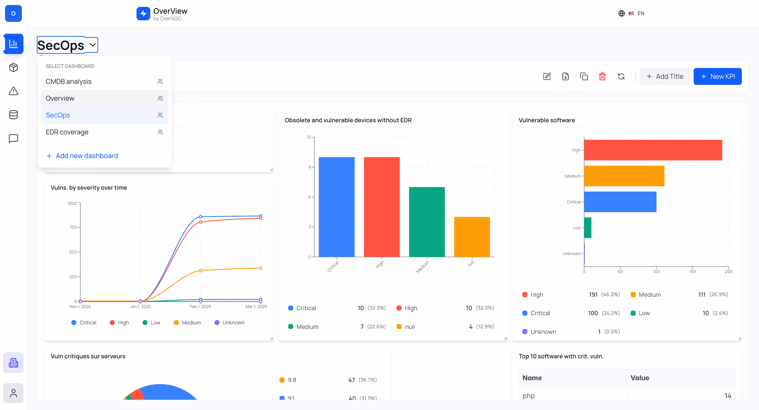 Bénéficiez de l'expertise de vos pairs : exploitez des tableaux de bord prêts à l'emploi et éprouvés par nos clients. Créez n'importe quel KPI en croisant vos données multi-sources de façon simple et intuitive. Vérifiez instantanément votre conformité (NIS 2, ISO 27001, Guide d'hygiène de l'ANSSI...) grâce à notre bibliothèque de tableaux de bord métiers.